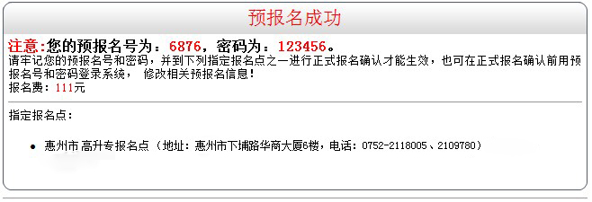 如报名后出现此些图,则表示预报名成功。 请妥善保存——预报名顺序号和密码。如有条件,可打印预报名成功界面。