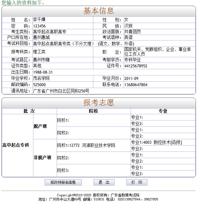 注意1:填写考生基本信息,要求准确无误。 (1)、密码(6位数字):任意6位数字,以后查询时使用。如统一报名,建议统一密码。 (2)、考生类别: 专科升本科类 (即专升本) 高中起点高职高专(即专科) (3)、考试县区: (即考试地点。) (4)、专科毕业证书号:如应届毕业生,尚未取得证书的。填写——待定 (5)、院校(代码):请点击“报考志愿”右边 (6)、专业(代码):请点击“报考志愿”右边