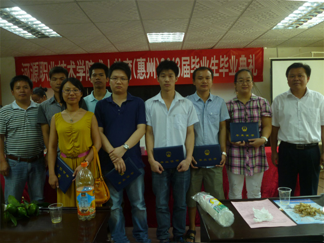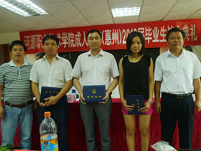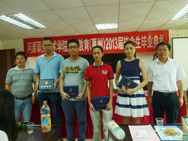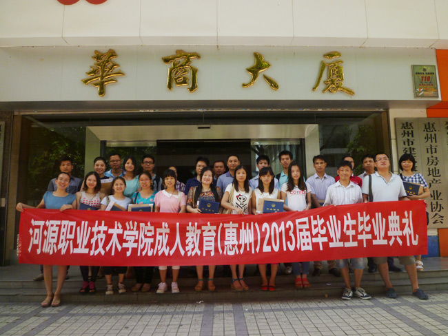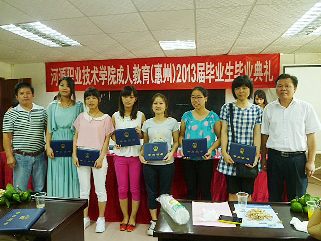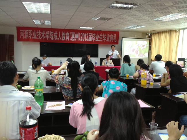 又到了7月,榴莲飘香的季节,也是毕业的季节。7月28日上午,惠州分校举行了简单而不失隆重的2013届河源职业技术学院成人教育毕业典礼。 与会的嘉宾有河职院继续教育学院戴春平院长,国际集团董事兼惠州分校校长李小龙,及惠州分校的教职员工。在庄严的国歌下,毕业典礼正式开始了。首先戴院长为毕业典礼致词,戴院长以他自己亲身的经历,和大家分享了学历的重要性和个人提升的必要性,精彩的讲演给大家留下了深刻的印象。接着,学员黄丽萍代表毕业生讲毕业感言,她回顾了过去的点点滴滴,感谢达德老师的辛勤付出,并祝福同学们前程似程,达德学校越办越好!话语不多,但却代表着同学们的心声。在毕业典礼上,学校为同学们准备了聚会的食品,大家边吃边聊,氛围愉快。 接着班主任范老师为典礼总结,感谢同学们二年多来对她工作的支持,及对学校的认可。祝贺大家顺利毕业,也衷心希望学员们能不断地提升自己,在社会上立于不败之地。范老师的肺腑之言令同学们都非常感动,典礼上响起了热烈的掌声。 最后,戴院长和李校长为毕业生颁发毕业证书,这一时刻激动人心,人人的脸上都洋溢着难以表达的开心和喜悦!2013届河职院毕业典礼在热烈的掌声中谢幕,会后,全体毕业生合影留念。 海阔凭鱼跃,天高任鸟飞。今天的毕业,不是庆祝“结束”,而是欢呼“开始”,不是纪念“完成”,而是宣布“进步”。2013届成考毕业生,让你们的生命之舟新的岁月港湾里启航,载着对太阳的憧憬和对未来的畅想,直挂云帆,乘风破浪!