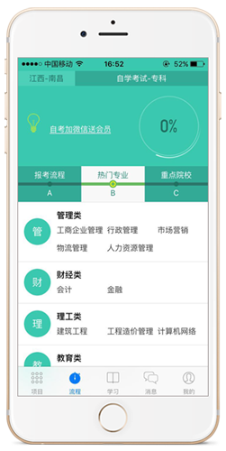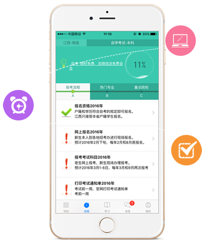 自学考试各省的报考时间、报名步骤都有所不同,每个省份又分不同的自考形式,从报考到毕业,每个环节都有一套步骤。除此之外每个院校的专业都有不同的课程计划。伴我考APP梳理全国的报考信息,但只给你本地区的清晰指引:报名、审核、现场确认、缴费、报考、考试、查询成绩、论文答辩、办理毕业等,让你顺利报考本地重点大学和心仪的专业。