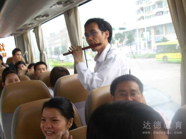 在途中,学员们兴高采烈,依次进行自我介绍,展现各自的才艺.瞧!行政管理专业学员正在为大家表演笛子独奏---《让我们荡起双浆》,在悠扬的笛声中,学员们也互动起来。有的唱歌、有的吹琴、有的说书……在一片欢歌笑语声中,我们来到了期盼以久的学府---中山大学。