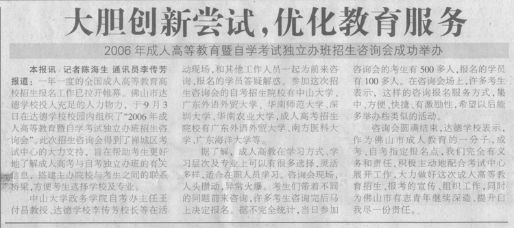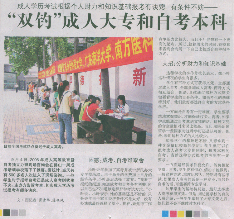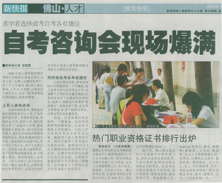 2006年佛山市自考、成考咨询会在佛山达德学校圆满落下帷幕。本次咨询会得到了考试中心及佛山日报、珠江时报、广州日报、新快报等媒体的大力支持。咨询会场人头攒动,异常火爆。