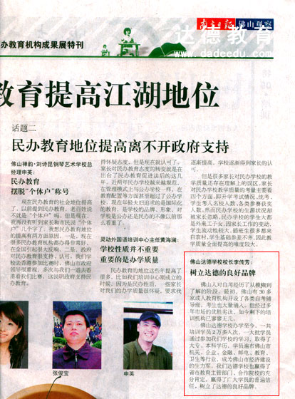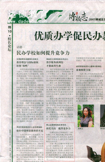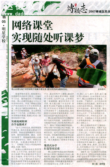 会上禅城区教育局领导及民办教育协会的领导作了民办教育成果的报告,对民办教育各单位为佛山市教育事业所作的贡献给予了鼓励和赞扬。南方日报佛山观察对此次民办教育成果展发行了“博校志”特刊,佛山市达德学校的自考和网络课堂结合的自考教学新模式成为此次报道的亮点。
