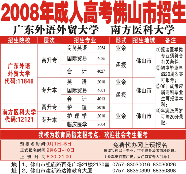 二、报名地址:佛山市祖庙路百花广场21楼2130室(教育局指定报考点)