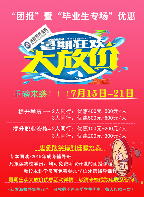 3、3人及以上同行报读自考、网教项目,优惠500元/人,报读成考项目,优惠600元/人。