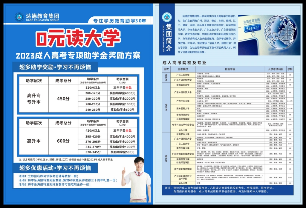 佛山市达德自学考试辅导学校(以下简称佛山达德教育)创办于1993年,2023年恰30周年。30年来秉承校训“自强、弘毅、厚德、拓新”,以“培养人才,服务社会”为宗旨办学,以社会助学单位的角色恪尽职守,正规助学希求提升学历的社会有志青年。2022年我校推出的助学社会专项活动,确实让学有能力、力争上进的学员获得了2022年度提升学历报读成人高考专项助学奖奖励。助学之乐在于学员乐学且学有所获、学有所成。虽然参加成人高等继续教育的社会青年大都有经济来源,各高校也没有设立减免学费政策,但为了响应发展高质量教育号召,也激励有志青年接受高质量的高等教育,佛山达德教育结合自身实际,2023年仍然希望能切实助学社会有志青年提升学历,增加就业竞争价值,继续推出助学社会专项活动:2023年提升学历报读成人高考专项助学社会活动——超多助学奖励,学习不再烦恼。