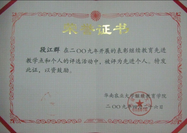 热烈祝贺广州达德段江群同志被评选为“华南农业大学继续教育教学点先进个人”!