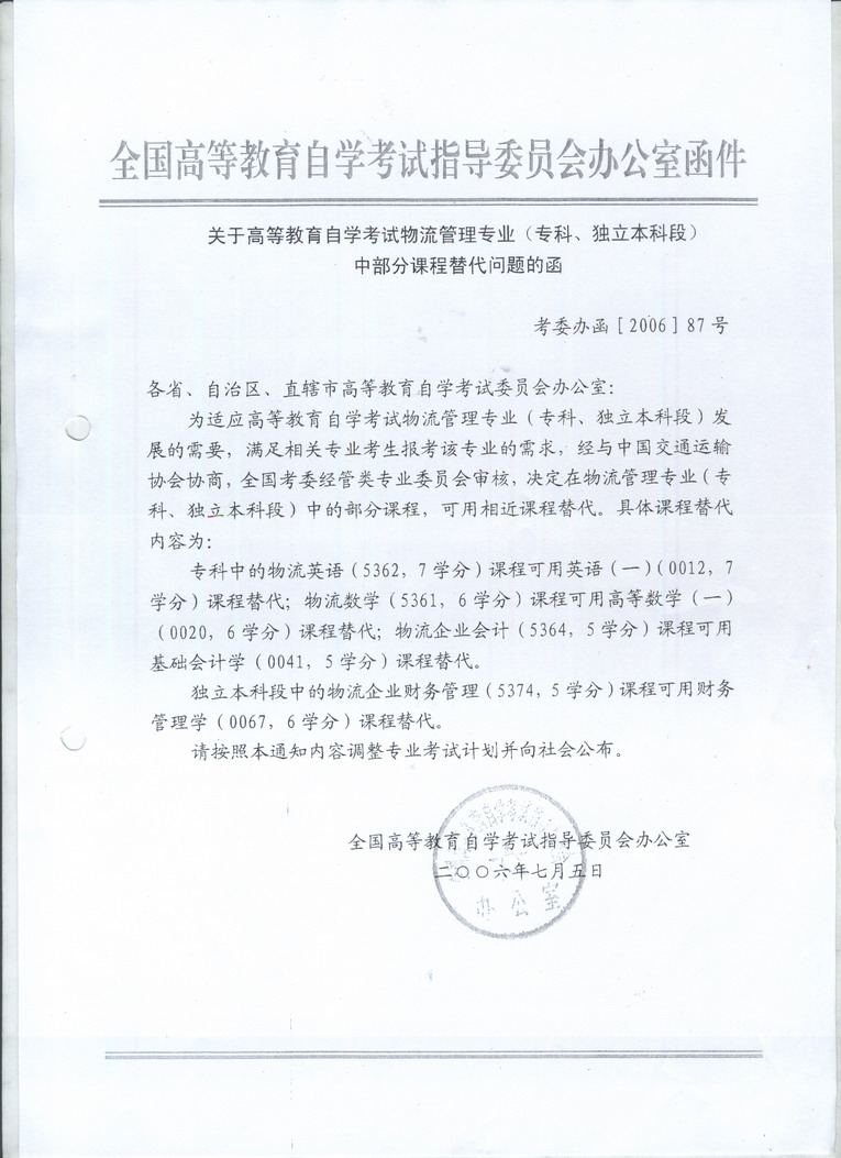 转自:关于自考物流管理专业(专科、独立本科段)中部分课程替代问题的函