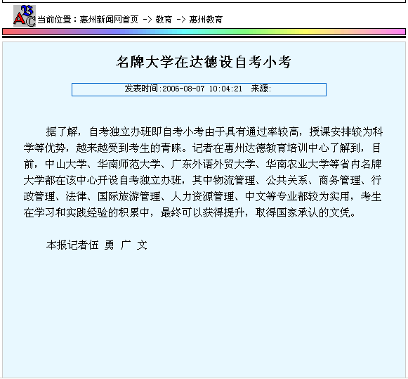 据了解,自考独立办班即自考小考由于具有通过率较高,授课安排较为科学等优势,越来越受到考生的青睐。记者在惠州达德教育培训中心了解到,目前,中山大学、华南师范大学、广东外语外贸大学、华南农业大学等省内名牌大学都在该中心开设自考独立办班,其中物流管理、公共关系、商务管理、行政管理、法律、国际旅游管理、人力资源管理、中文等专业都较为实用,考生在学习和实践经验的积累中,最终可以获得提升,取得国家承认的文凭。