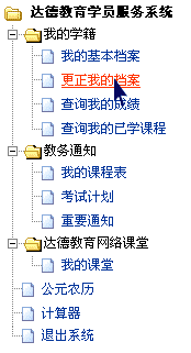 学员服务系统提供学籍档案的查看修改,成绩、课程的查询,课程表、考试计划和通知的查看,并在网页左侧功能导航菜单下部提供网上课堂的入口。