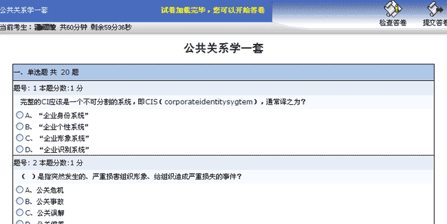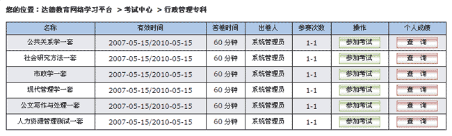3. 考试中心。点击专业名,右面的列表将会列出您专业的试卷供测试用。