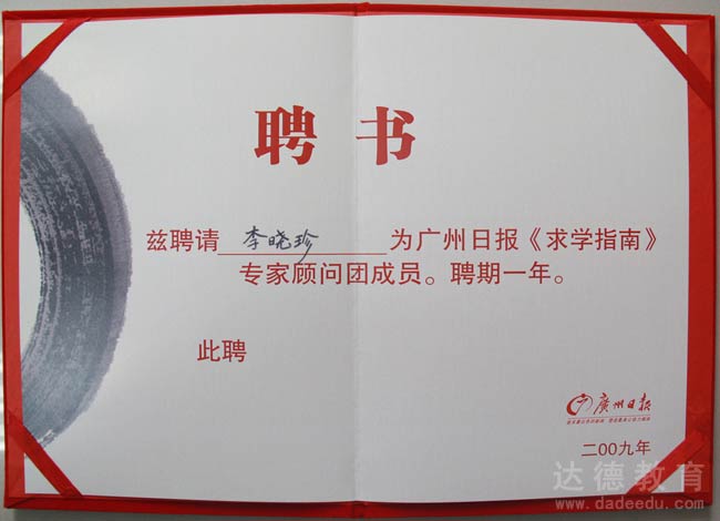达德教育李晓珍董事长受聘广州日报求学指南版专家顾问 |