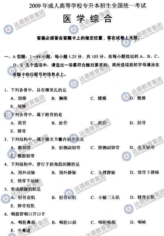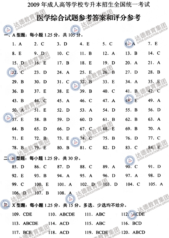 2009年成人高考专升本医学综合试题及参考答案