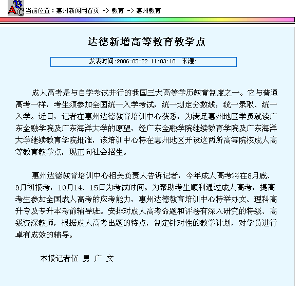 成人高考是与自学考试并行的我国三大高等学历教育制度之一。它与普通高考一样,考生须参加全国统一入学考试,统一划定分数线,统一录取、统一入学。近日,记者在惠州达德教育培训中心获悉,为满足惠州地区学员就读广东金融学院及广东海洋大学的愿望,经广东金融学院继续教育学院及广东海洋大学继续教育学院批准,该培训中心特在惠州地区开设这两所高等院校成人高等教育教学点,现正向社会招生。