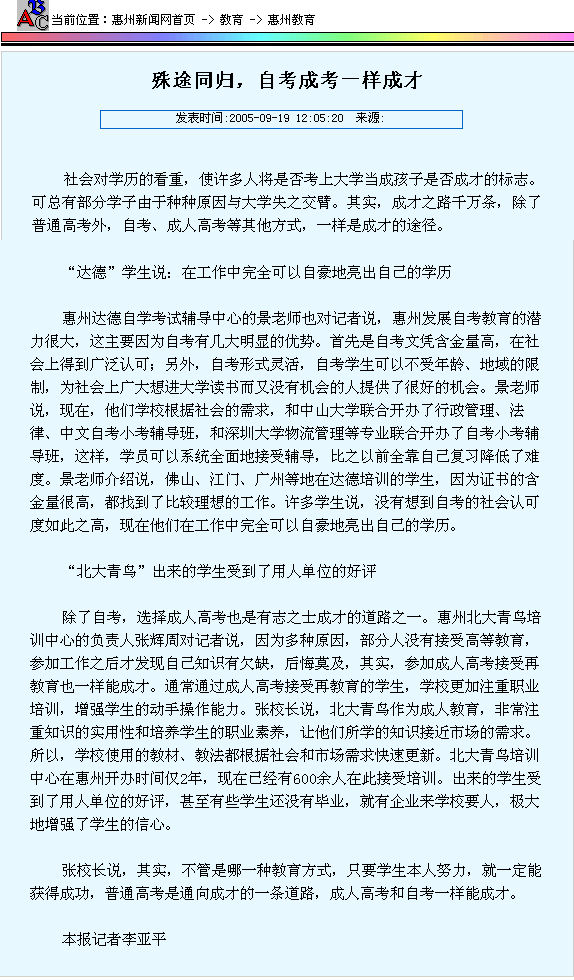 除了自考,选择成人高考也是有志之士成才的道路之一。惠州北大青鸟培训中心的负责人张辉周对记者说,因为多种原因,部分人没有接受高等教育,参加工作之后才发现自己知识有欠缺,后悔莫及,其实,参加成人高考接受再教育也一样能成才。通常通过成人高考接受再教育的学生,学校更加注重职业培训,增强学生的动手操作能力。张校长说,北大青鸟作为成人教育,非常注重知识的实用性和培养学生的职业素养,让他们所学的知识接近市场的需求。所以,学校使用的教材、教法都根据社会和市场需求快速更新。北大青鸟培训中心在惠州开办时间仅2年,现在已经有600余人在此接受培训。出来的学生受到了用人单位的好评,甚至有些学生还没有毕业,就有企业来学校要人,极大地增强了学生的信心。