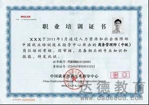 商务管理师、金融服务师国家职业培训项目经中华人民共和国人力资源和社会保障部中国就业培训技术指导中心(CETTIC)正式立项,学员参加培训合格者,由人力资源和社会保障部中国就业培训技术指导中心颁发CETTIC职业培训合格证书,该证书可以作为培训学员从业的凭证,同时也可作为申请职业技能鉴定时,接受过相关职业资格培训的证明。