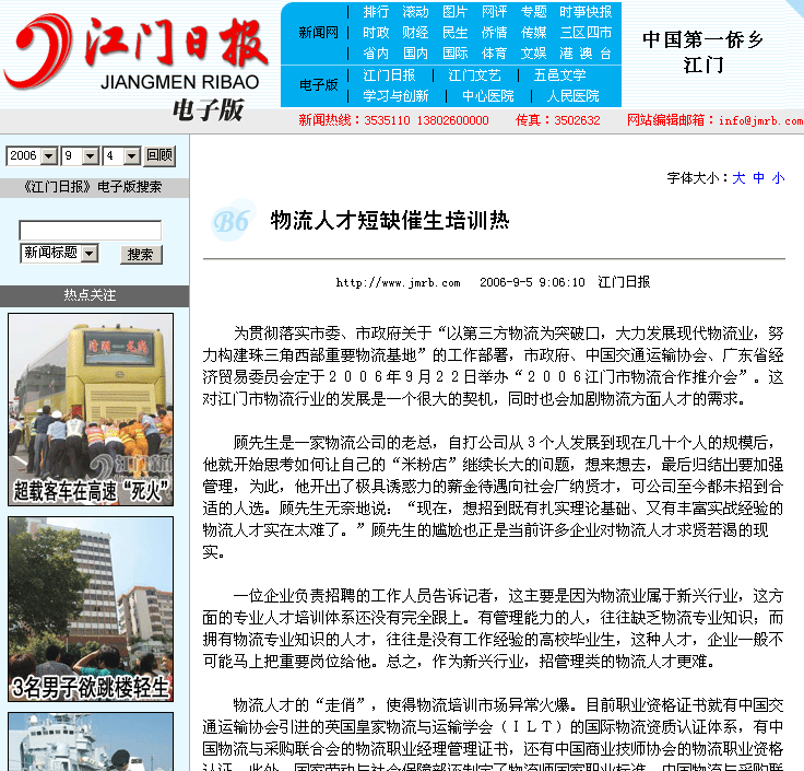 为贯彻落实市委、市政府关于“以第三方物流为突破口,大力发展现代物流业,努力构建珠三角西部重要物流基地”的工作部署,市政府、中国交通运输协会、广东省经济贸易委员会定于2006年9月22日举办“2006江门市物流合作推介会”。这对江门市物流行业的发展是一个很大的契机,同时也会加剧物流方面人才的需求。