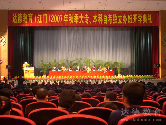 在这秋风送爽,丹桂飘香的金秋时节,达德教育集团江门分校2007年秋季独立办班开学典礼暨优秀表彰大会于十一月四日上午在江门市工人电影院隆重举行。出席典礼的领导和嘉宾有:广东省考试院自考办副主任、自考部主任黄列波先生、达德教育集团董事长、北京达德教育研究院院长李晓珍先生、华南农业大学继续教育学院黄大乾院长、中山大学高等继续教育学院刘正锡副院长、中山大学高等继续教育学院原院长戴瑞华先生、江门市教育局职成办主任徐卫江先生、中山大学高等继续教育学院自考办赵国清主任、达德教育集团副董事长、佛山达德学校校长李传芳先生。同时,近四百多名新生共同见证了这次典礼。